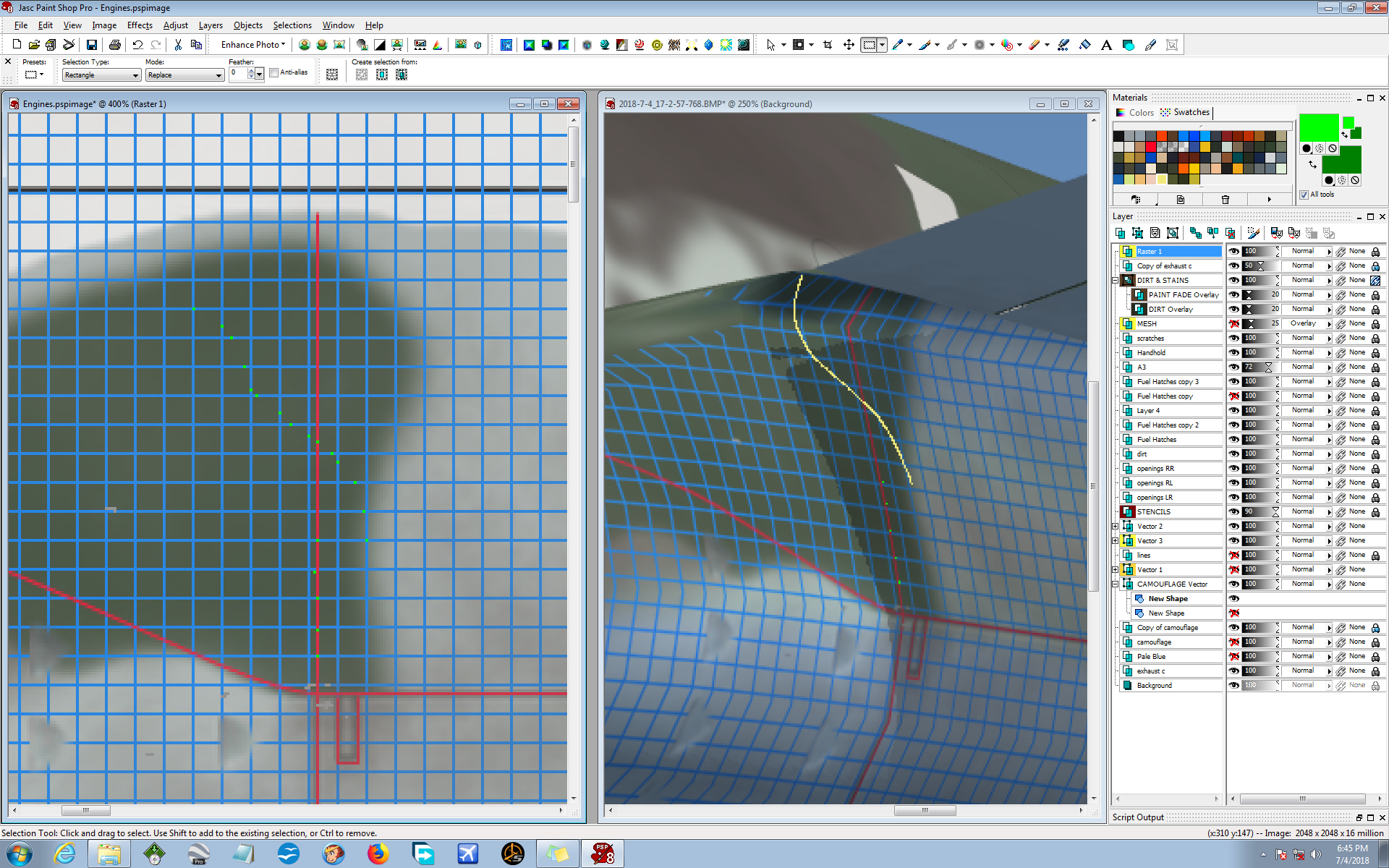 I layed down a Graph on a temporary layer, aligned it with some panel lines to give me a solid reference point; then I recreated the DDS file using my temporary graphics. The screenie shows where I aligned the graph on some panel lines, that I also changed to red so that I could see them better. (Maybe I didn't need to do that, but I have made it a habit to do such things in case it might help me.) I opened the DDS file for the engines with DTXBmp, painted the engines with my weird temporary graphics and took some screen shots.